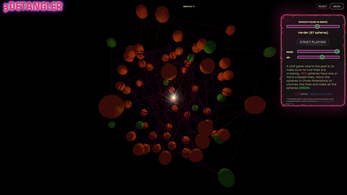 Each game is a randomly generated cluster of spheres that are connected to each other by purple lines. If any two lines cross, the spheres they connect to will be coloured red. Spheres without any crossed lines are coloured green. The game is over when all spheres are green.